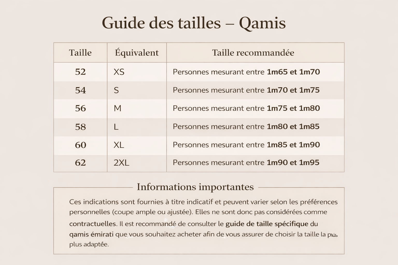 Veuillez noter que ces indications sont fournies à titre indicatif et peuvent varier en fonction des préférences personnelles elle ne sont donc pas considérées comme contractuelles. Il est donc recommandé de consulter les guides de taille spécifiques fournis pour le qamis émirati que vous souhaitez acheter afin de vous assurer d’obtenir la taille qui vous convient le mieux.